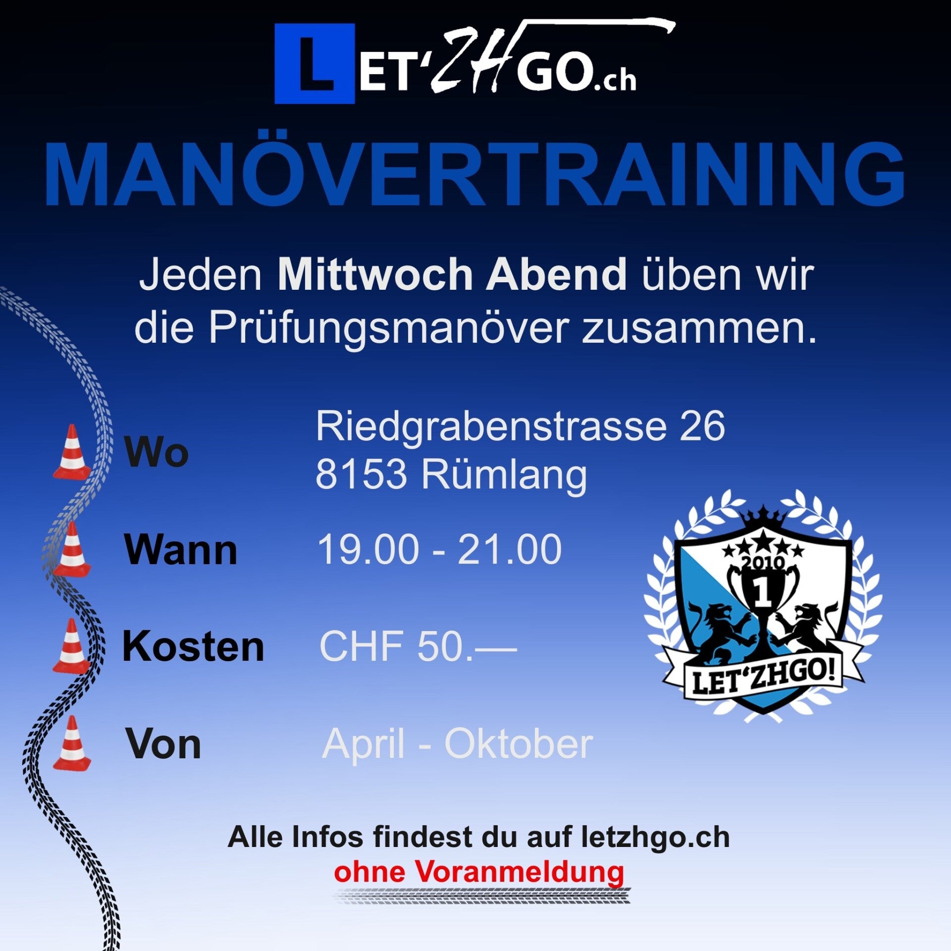 Wir, die Fahrschule Let’ZHgo!, stellen Dir einen Übungsplatz zur Verfügung. Originalgetreu, wie an der Prüfung. Auch auf Randabstände wurde geachtet, damit Du an der Prüfung nicht überrascht wirst.
